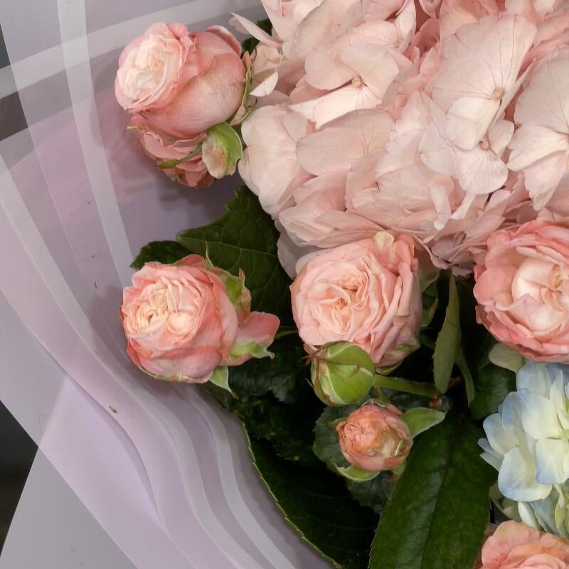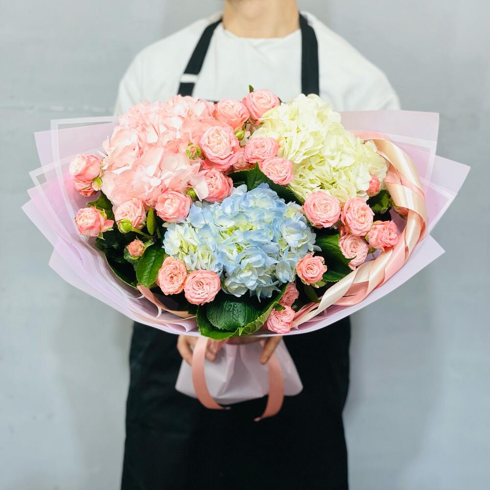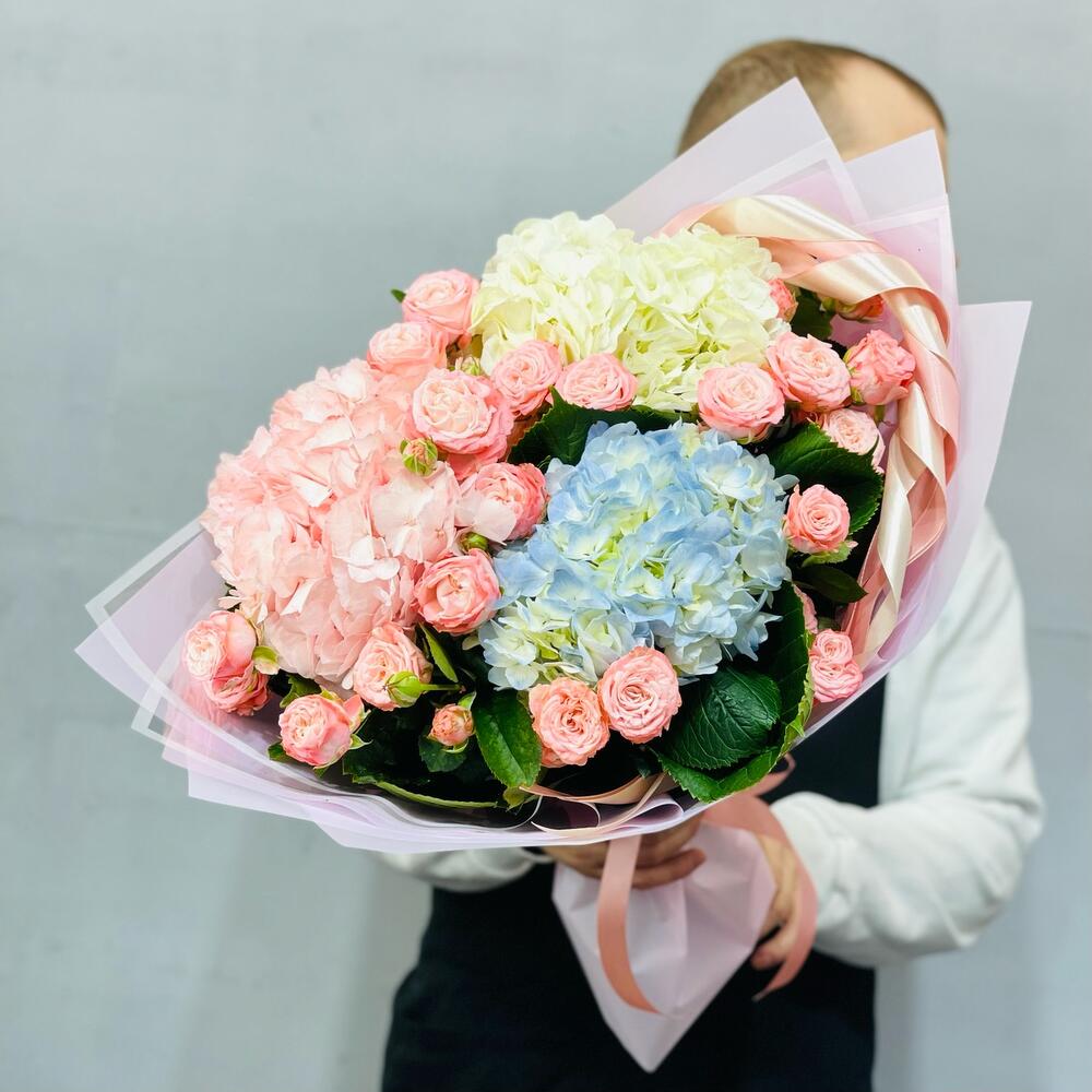 Гортензия – 3 шт.Лента атласная – 3 шт.Упаковка дизайнерская – 3 шт.мадам бомбастик пионовидная кустовая роза – 10 шт.