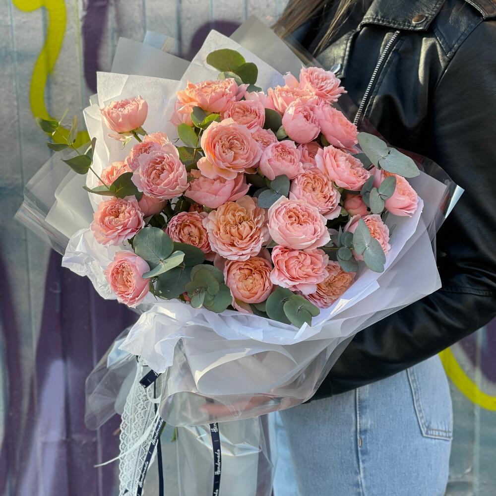 Букет из розовых гвоздик, пионовидных роз, эустом