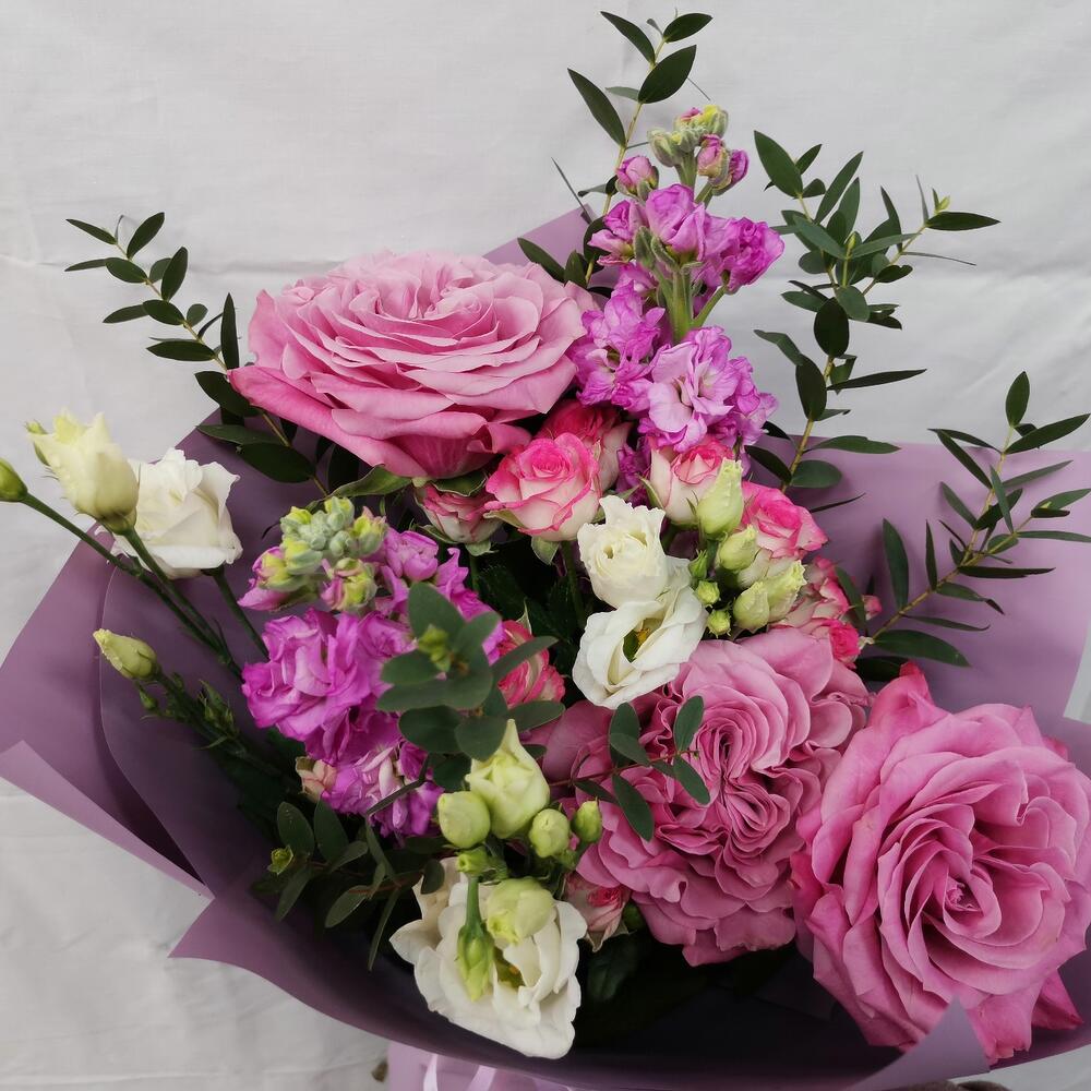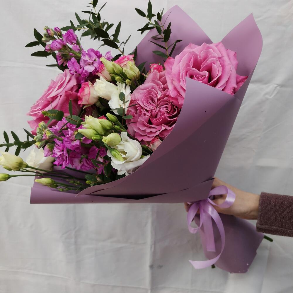 Маттиола – 2 шт.Роза кустовая – 1 шт.Эвкалипт – 2 шт.Лента атласная – 1 шт.Роза пионовидная – 3 шт.Упаковка дизайнерская – 1 шт.эустома белая – 2 шт.