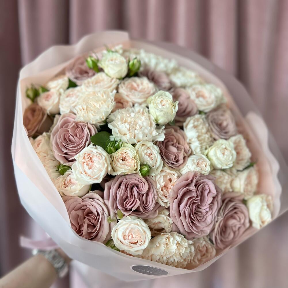 Авторский букет собран из кустовой пионовидной розы, а также эксклюзивного сорта пионовидной одноголосой розы в дополнение с молочными диантусами в декоративной упаковке.