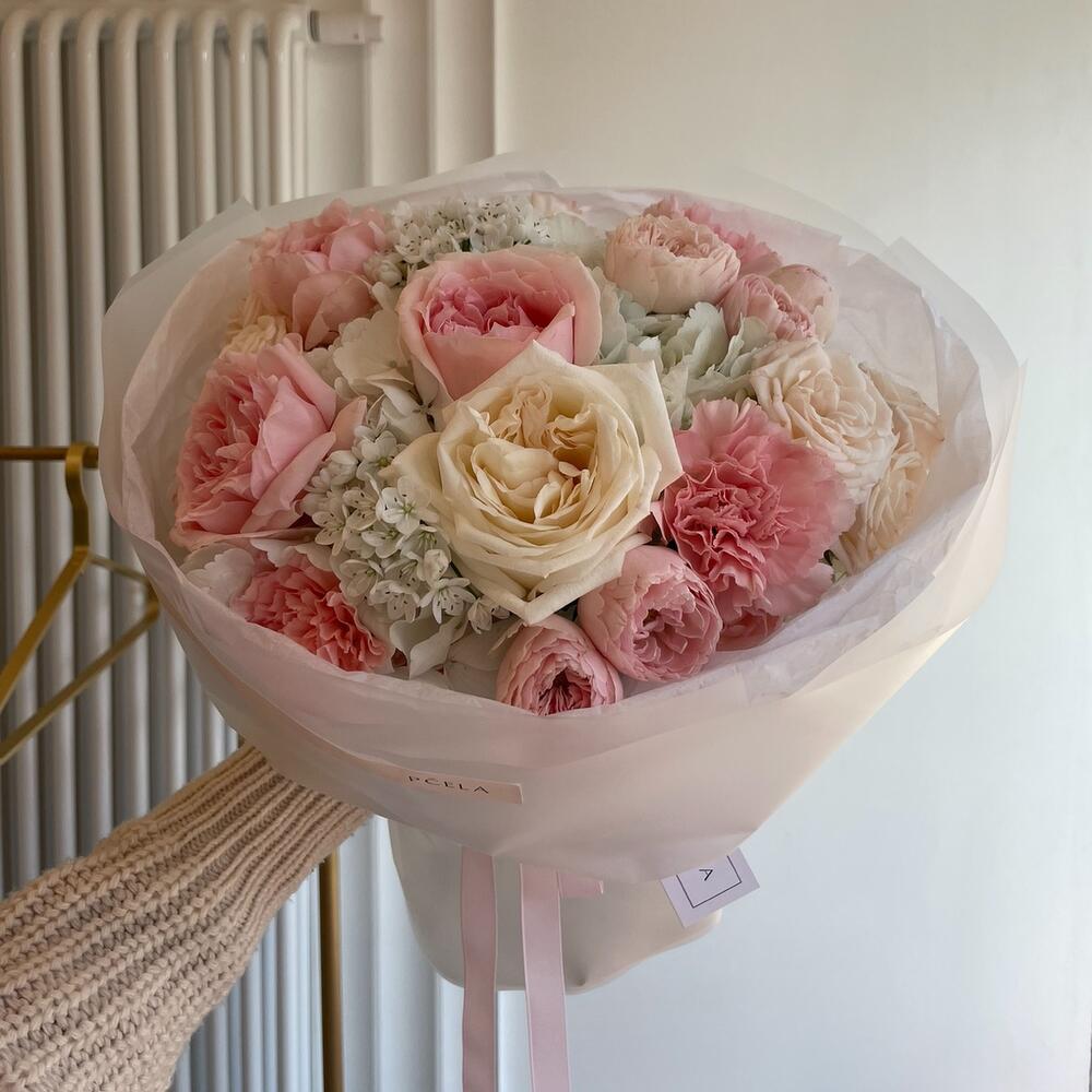 Гвоздики, Лизиантусы, Розы, Тюльпаны