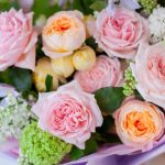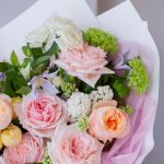 Букет из французской розы, эустомы, маттиолы и кустовой пионовидной розы Джульетта с эвкалиптом