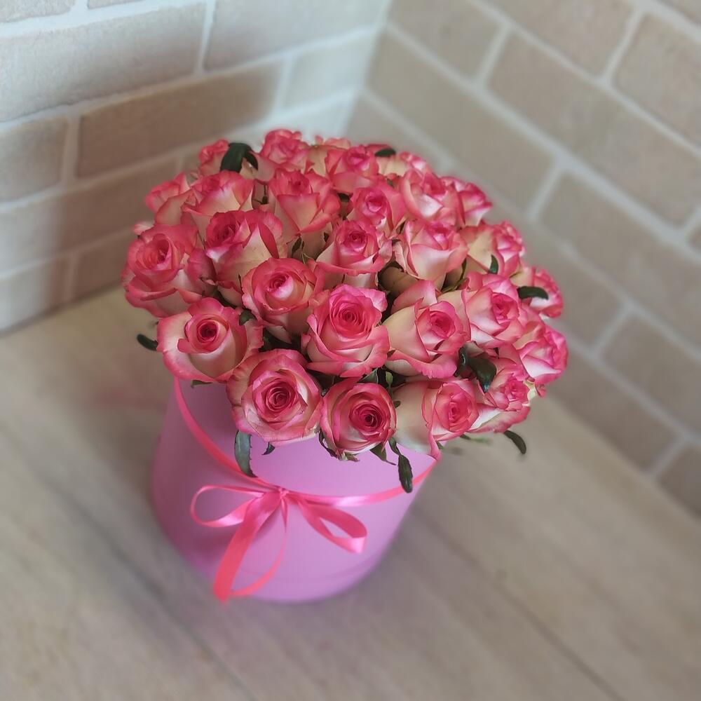Лента атласная – 1 шт.Коробка шляпная – 1 шт.Роза Джумилия – 29 шт.Оазис флористический – 1 шт.