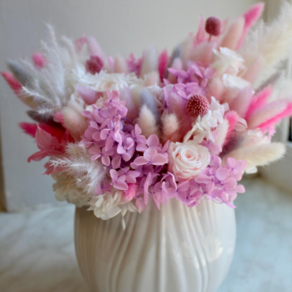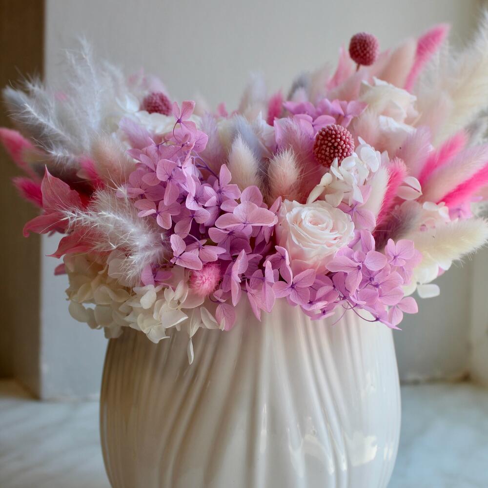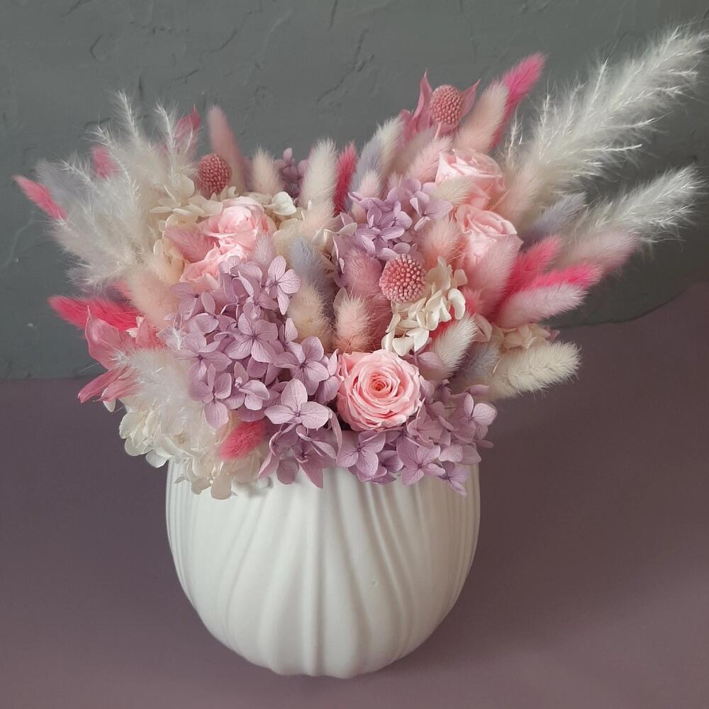 Роза одноголовая – 5 шт.Гортензия – 2 шт.пушистики – 1 шт.Керамическое кашпо – 1 шт.