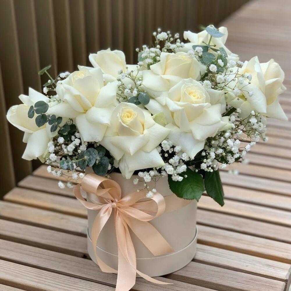 Коробка Жемчужина красоты из кустовых роз, альстромерии, эустомы и диантуса