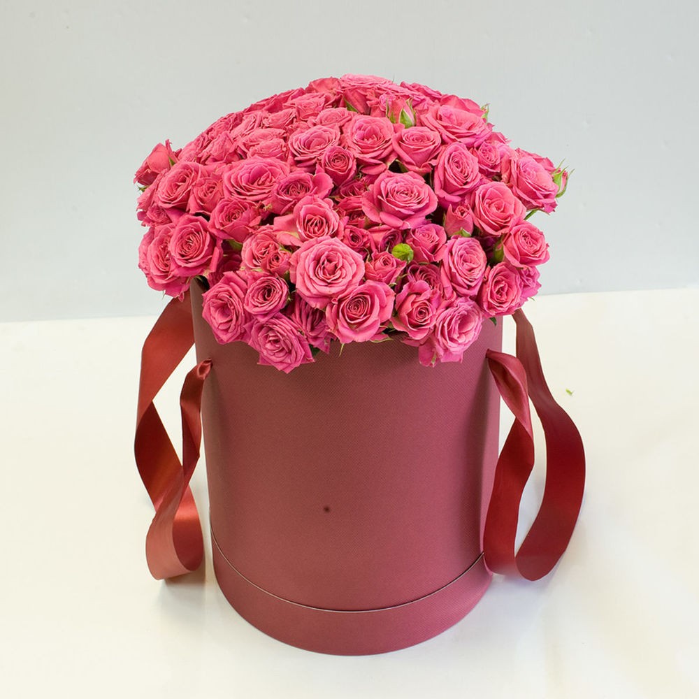 Ярко розовые кустовые розы в шляпной коробке. Цвет коробки может отличаться от фото.