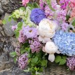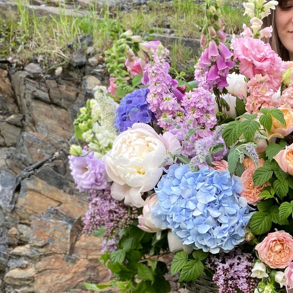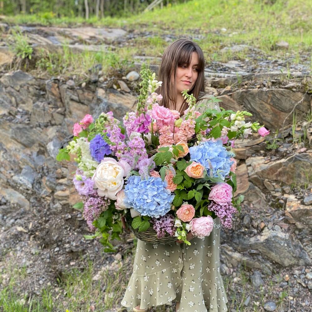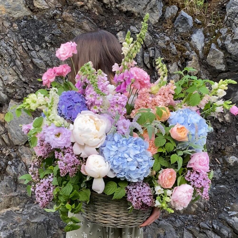 Садовая корзина с гортензиями, пионами, наперстянкой, ветками малины, пионовидными розами, сиренью, колокольчиками и травами.