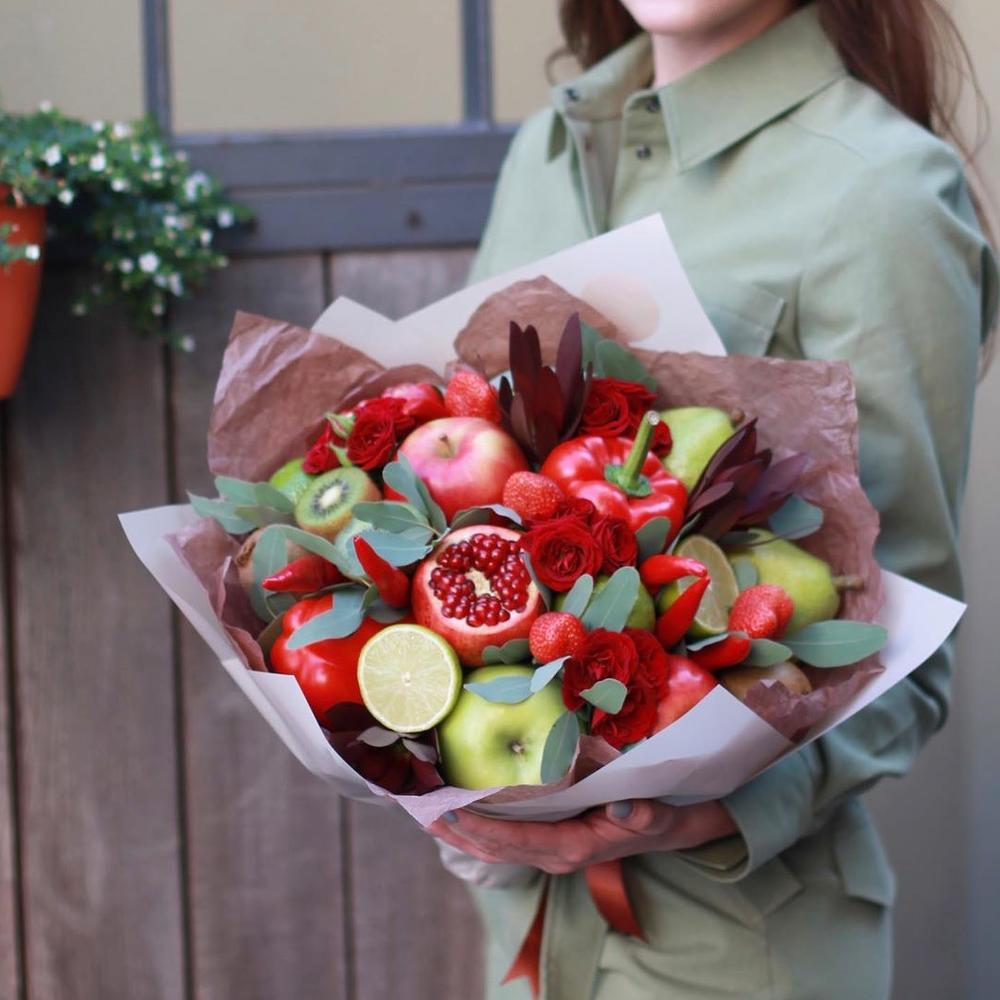 Клубника – 100 гр.Роза кустовая – 5 шт.Эвкалипт – 1 шт.Упаковка – 2 шт.Гранат – 1 шт.Киви – 3 шт.Яблоко – 3 шт.Лайм – 3 шт.Сафари – 3 шт.Груша – 2 шт.Перец острый – 2 шт.Перец – 2 шт.