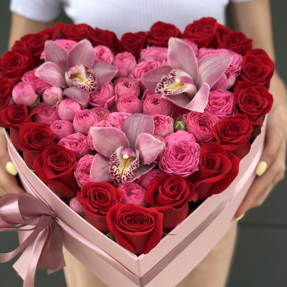 ЦИМБИДИУМ – 3 шт. Кустовая пионовидная роза – 9 шт. роза красная фридом – 21 шт. Оазис – 4 шт. Коробка сердце – 1 шт. Оформление – 1 шт.