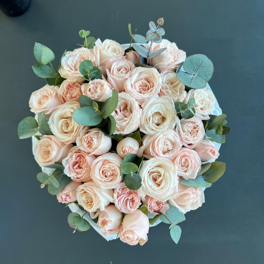 Кустовая роза – 7 шт.Эвкалипт – 4 шт.Шляпная коробка – 1 шт.