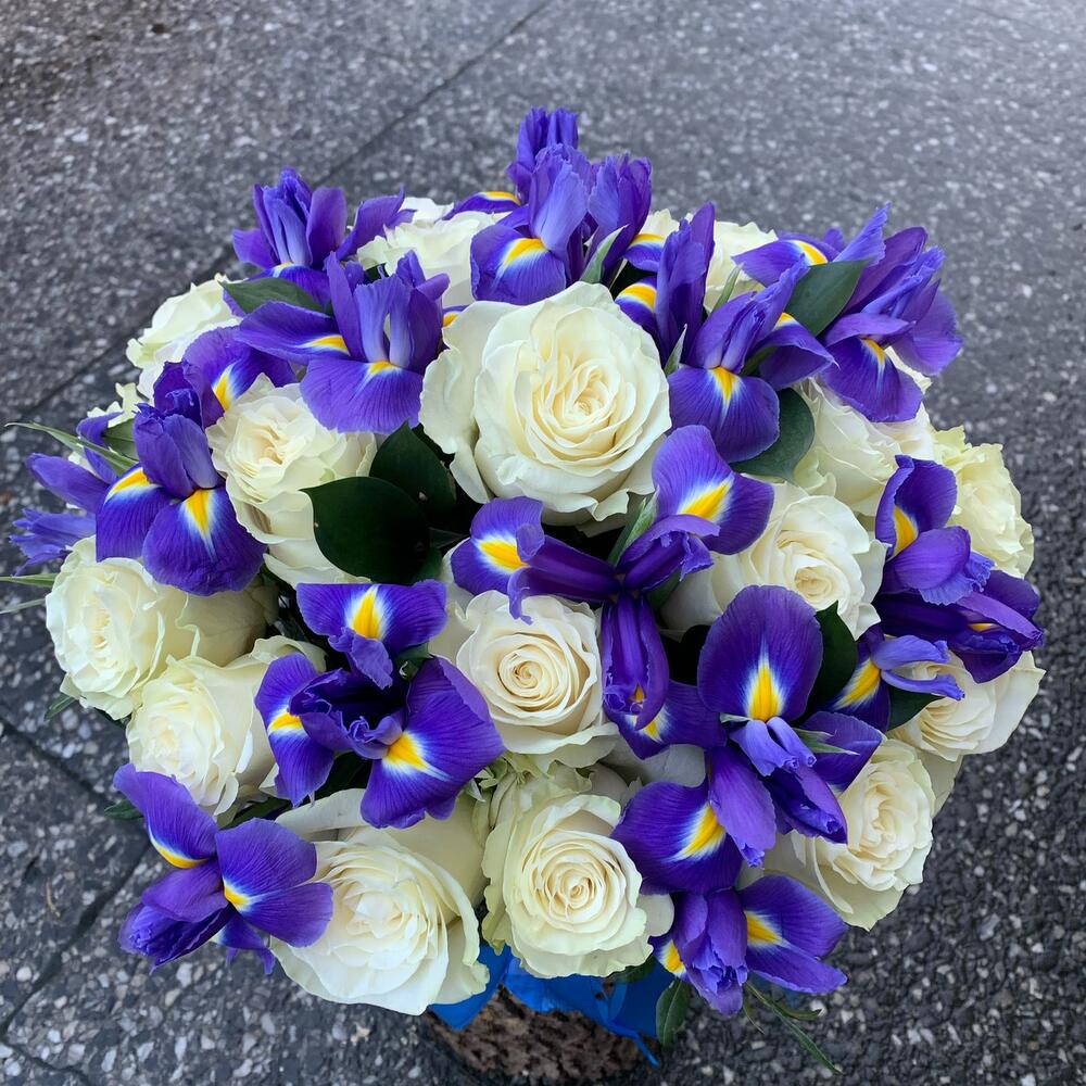 Шляпная коробка с белыми розами и ирисами «Восторг»