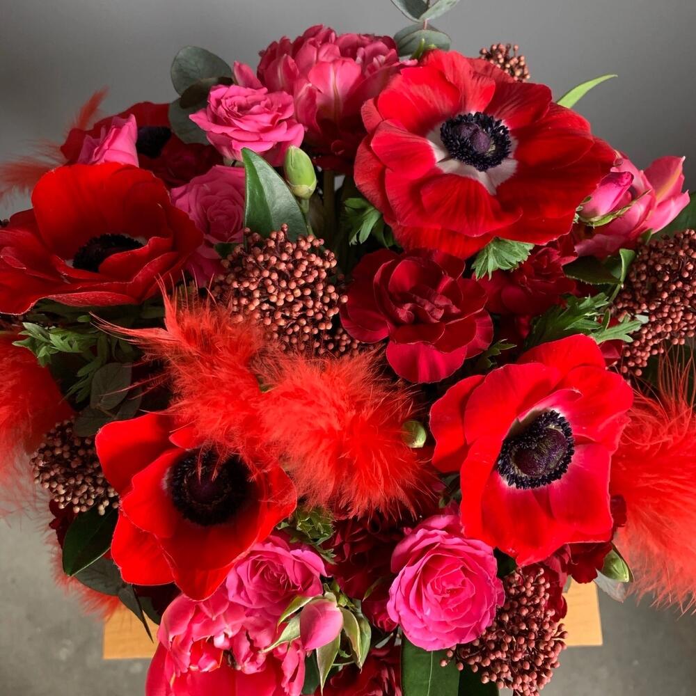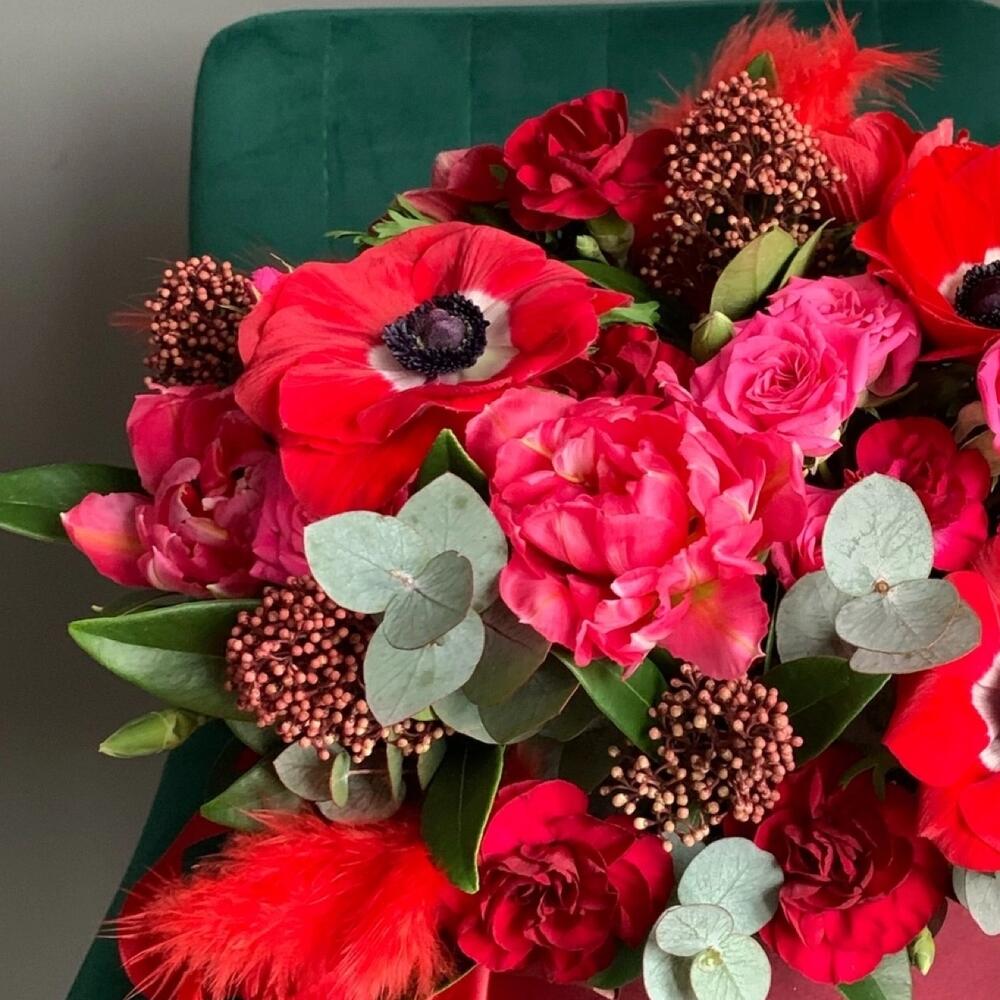 Анемон красный – 4 шт.Роза кустовая – 3 шт.Скиммия – 3 шт.Диантус кустовой – 4 шт.Тюльпан – 3 шт.Эвкалипт – 2 шт.Шляпная коробка – 1 шт.перья декор – 4 шт.