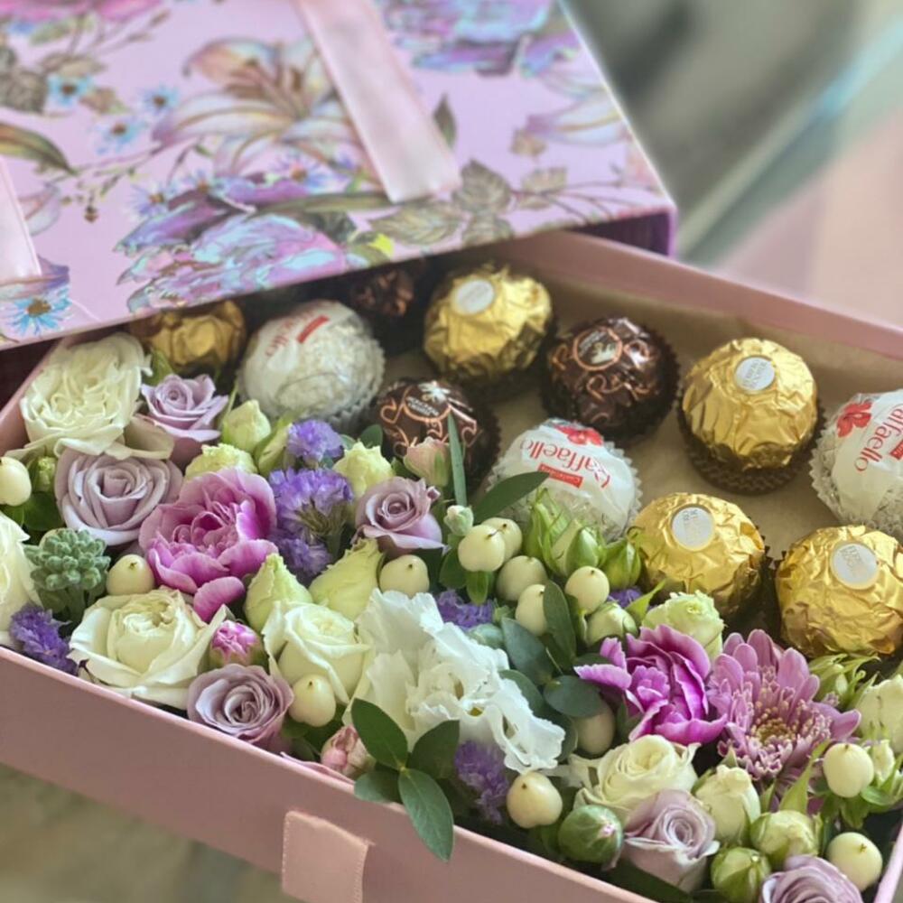 “Сладкое сердце ” – цветочная композиция с сладостями в коробке “Сердце”