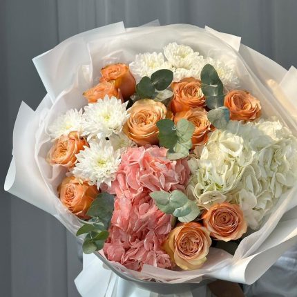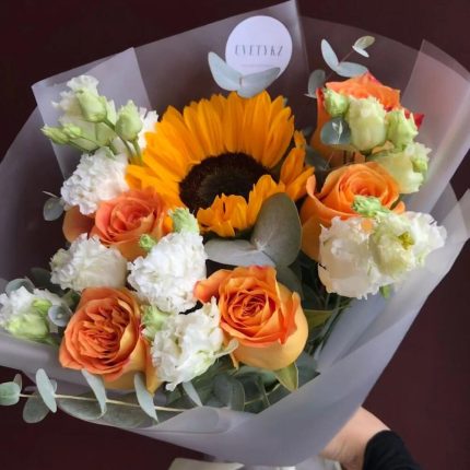 Флористы из студии "Varda Flowers" подобрали свежие и красивые цветы для создания букета, который наполнен положительными эмоциями и любовью. Они тщательно расположили каждый цветок в букете, учитывая его форму и цветовую гамму, чтобы достичь наилучшего гармоничного и красивого результата.