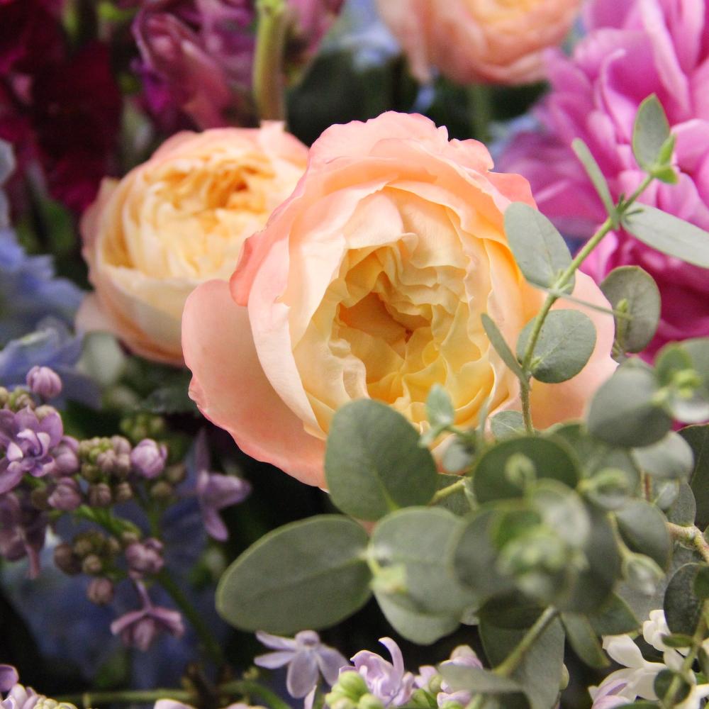 Садовая корзина с дельфиниумами, пионами, пионовидными розами, львиным зевом, сиренью и эвкалиптом.