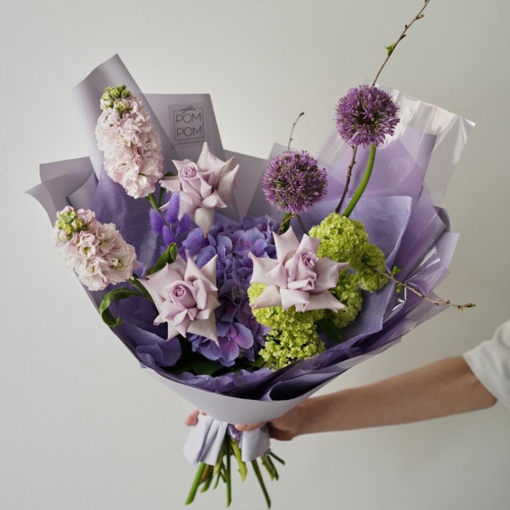 Гортензия – 1 шт.Аллиум – 5 шт.Роза – 3 шт.Прунус – 1 шт.Маттиола – 2 шт.Вибурнум – 1 шт.Упаковка дизайнерская – 1 шт.