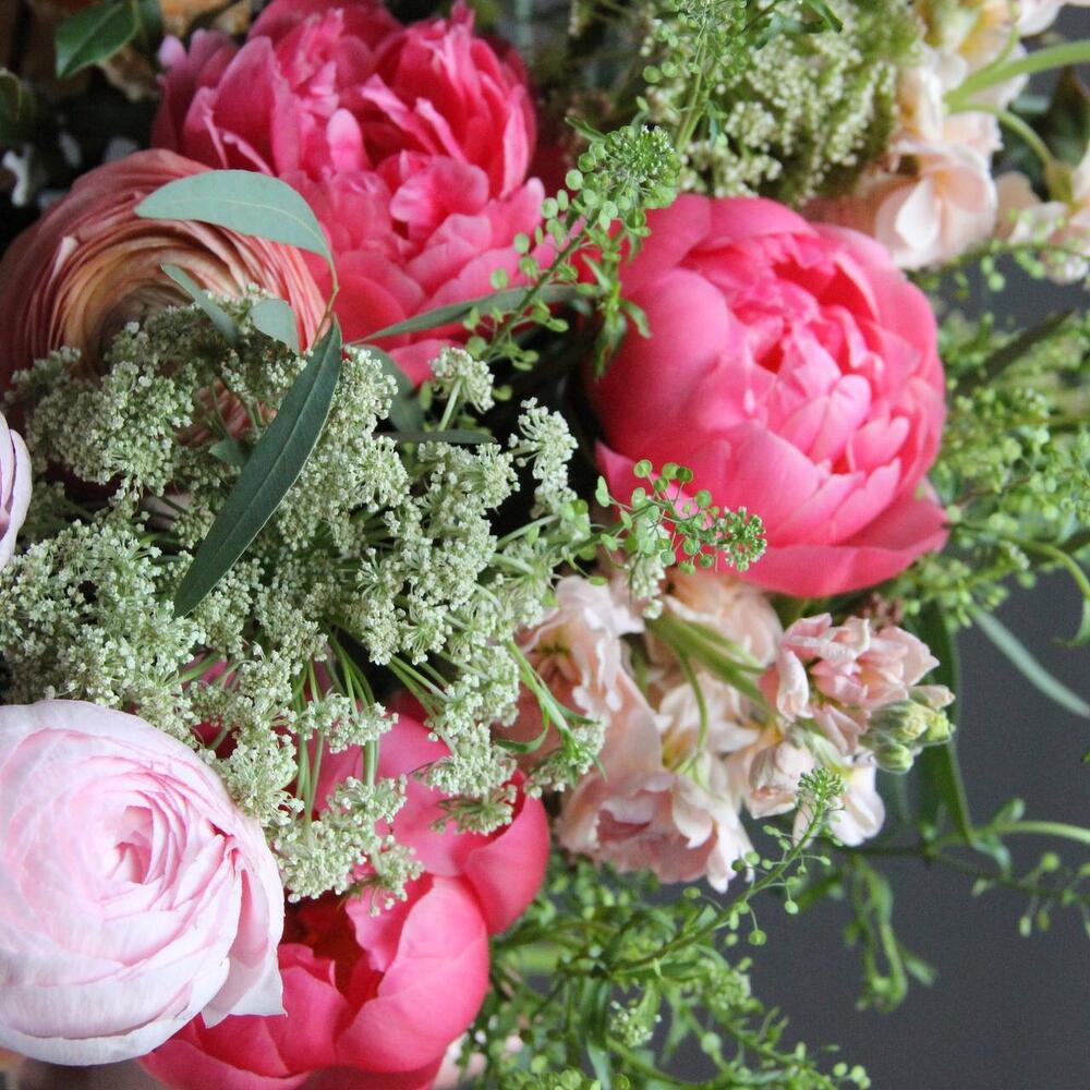 Пион – 5 шт.Амми – 2 шт.Пастушья сумка – 2 шт.Ранункулюс – 6 шт.Маттиола – 3 шт.Роза кустовая пионовидная – 1 шт.Гвоздика – 3 шт.Вибурнум – 3 шт.Лента атласная – 1 шт.