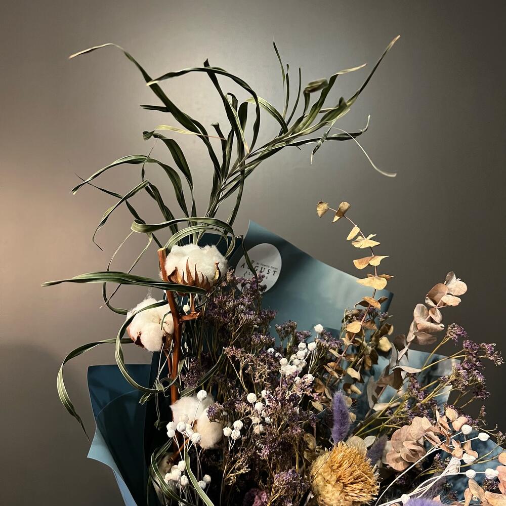 Хлопок ветка – 1 шт.амарант сухоцвет – 1 шт.Лагурус (сухоцвет) – 11 шт.Эвкалипт сухоцвет – 5 шт.пальма сухоцвет – 1 шт.лен сухоцвет – 5 шт.лимониум сухоцвет – 5 шт.артишок сухоцвет – 1 шт.Пленка матовая – 3 шт.Лента атласная – 1 шт.