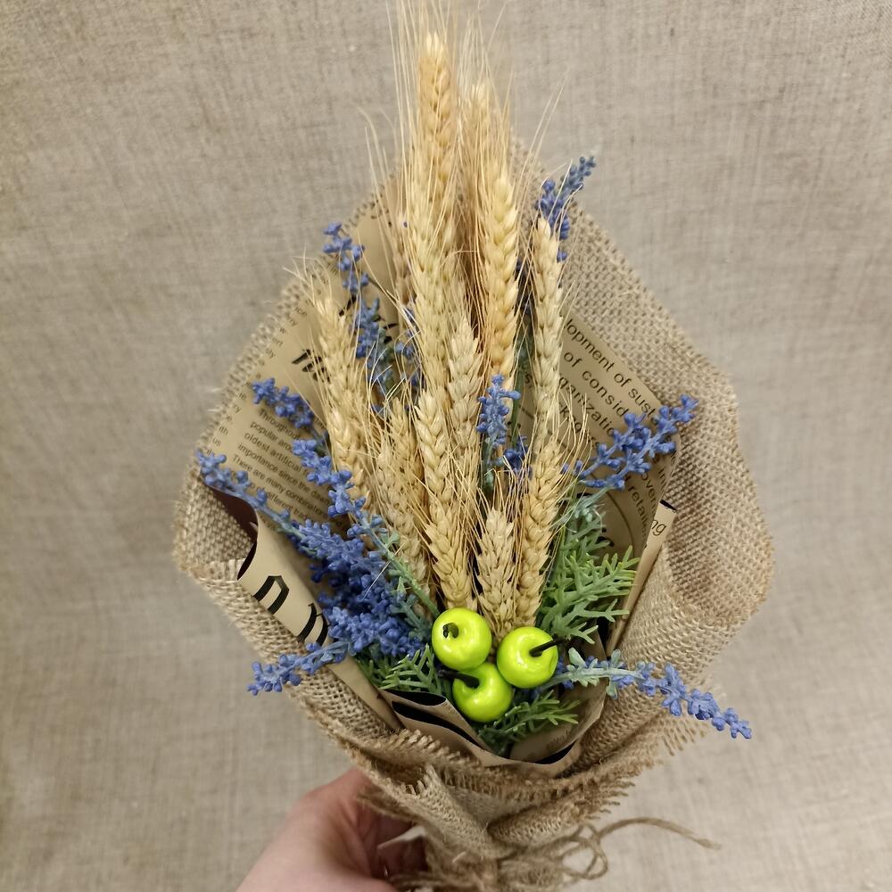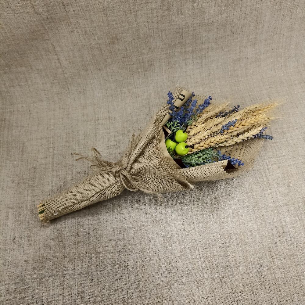Искусственная лаванда – 1 шт.Пшеница (сухоцвет) – 10 шт.яблоко декоративное – 3 шт.Авторская упаковка – 1 шт.Мешковина – 1 шт.бечевка натуральная – 1 шт.