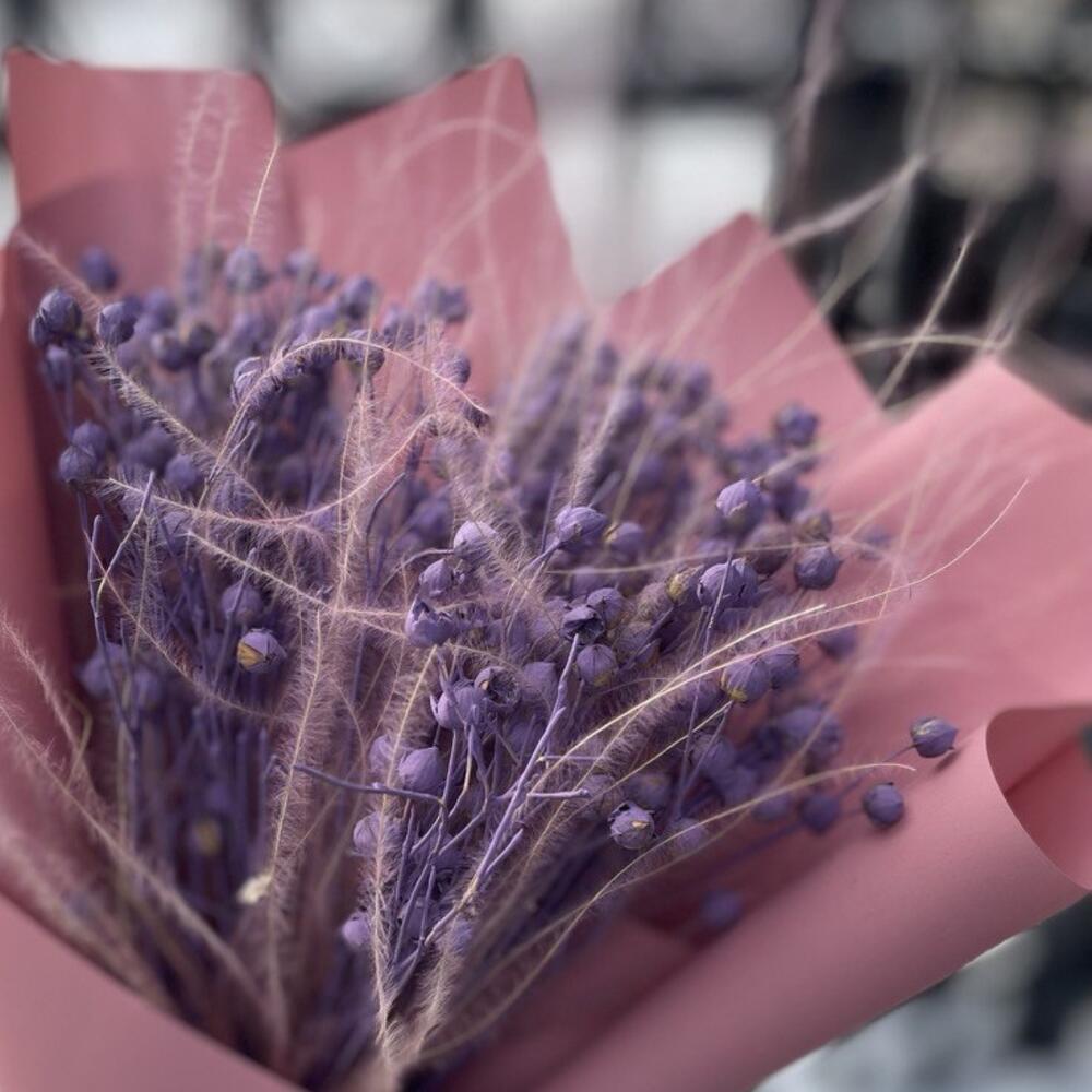 лëн сухоцвет – 10 шт.Ковыль – 9 шт.Упаковка дизайнерская – 4 шт.Лента атласная – 1 шт.