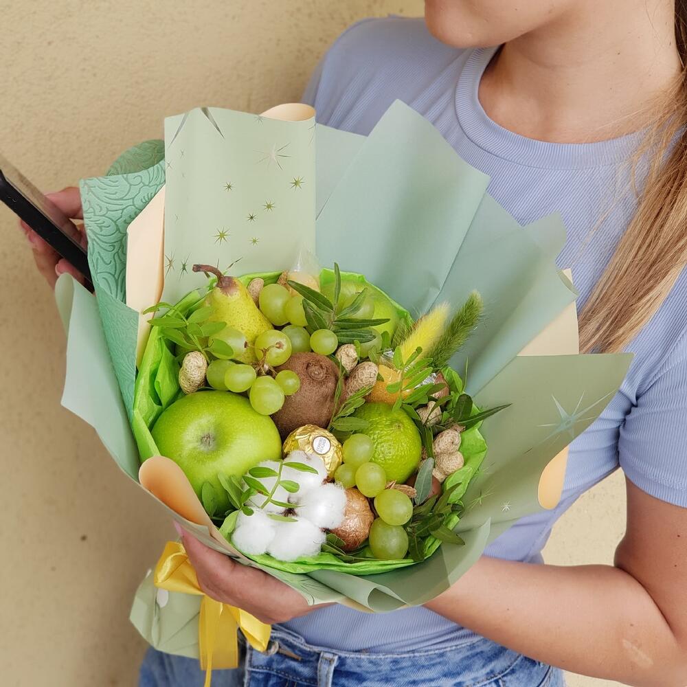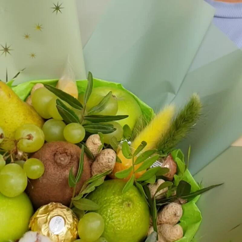 Виноград – 70 гр.Киви – 1 шт.Лайм – 1 шт.Груша – 1 шт.Миндаль – 10 гр.Арахис – 20 гр.коробка транспортировочная – 1 шт.грецкие орехи – 35 гр.яблоки – 2 шт.манговые конфеты – 2 шт.Конфеты Ferrero Rocher – 40 гр.орех макадамия в скорлупе – 1 шт.Хлопок – 1 шт.Лагурус (сухоцвет) – 2 шт.декоративная зелень – 1 шт.