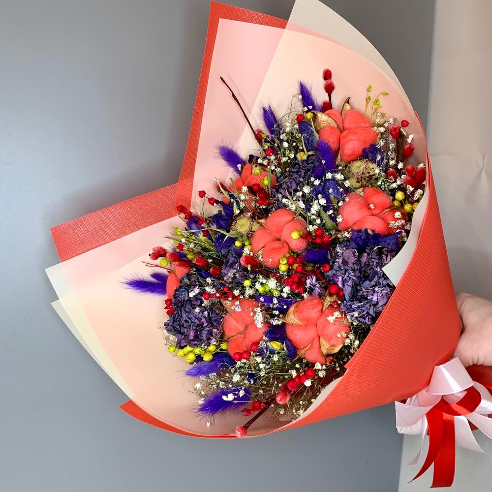 Яркий букет из различных сухоцветов с добавлением красного хлопка в красном оформлении ❤️