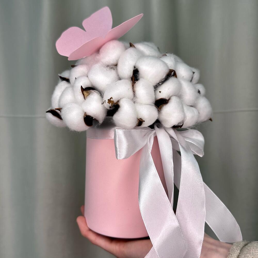 Композиция из натурального хлопка в шляпной коробке