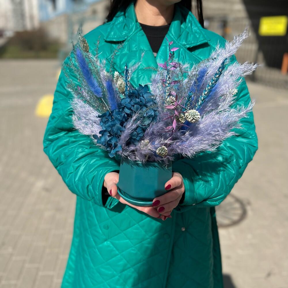 Гортензия – 1 шт.Пшеница – 6 шт.Лагурус – 10 шт.Кашпо керамическое – 1 шт.Фаларис – 16 шт.Оазис для сухоцветов – 1 шт.овес сухоцвет – 2 шт.кортадерия – 3 шт.мискантус – 1 шт.