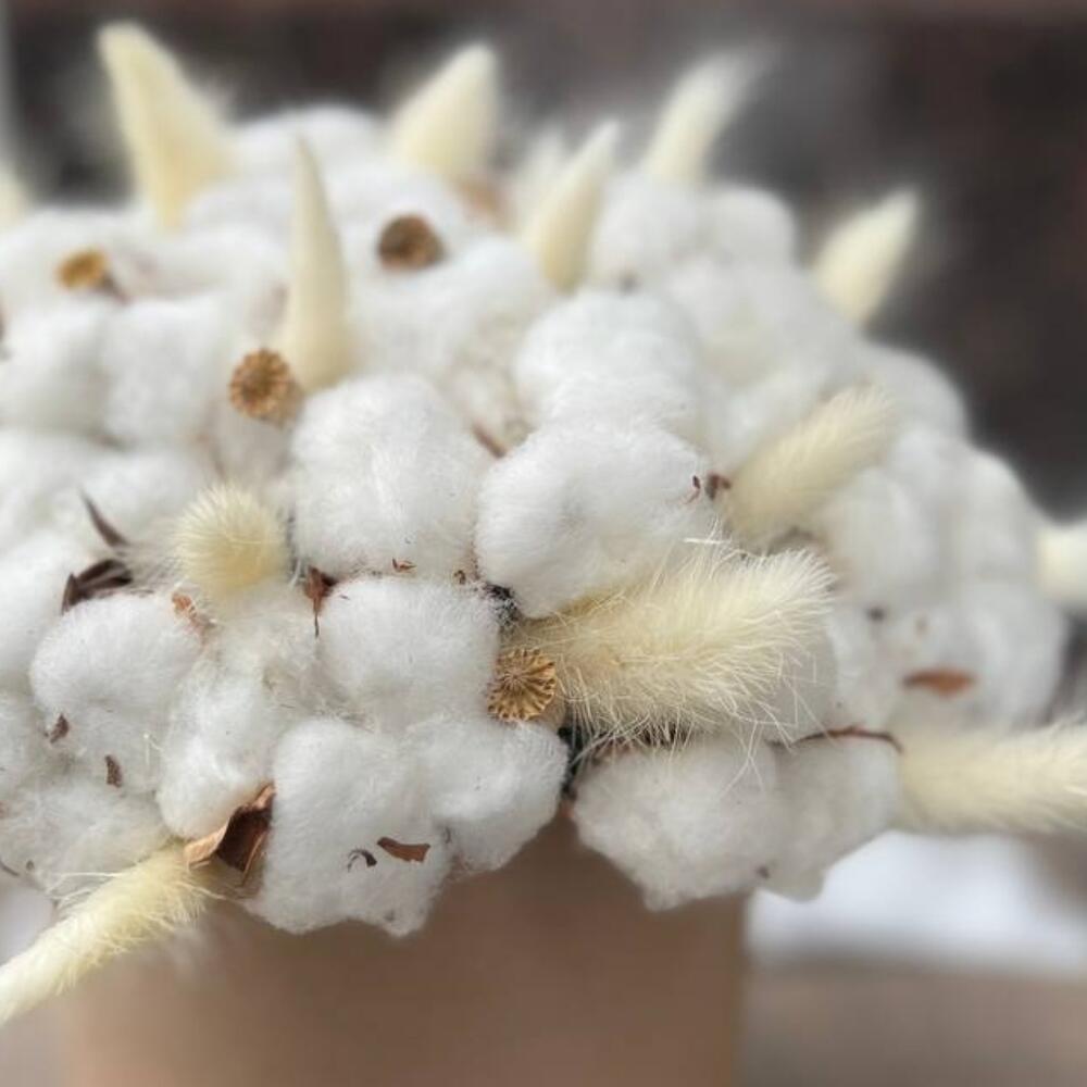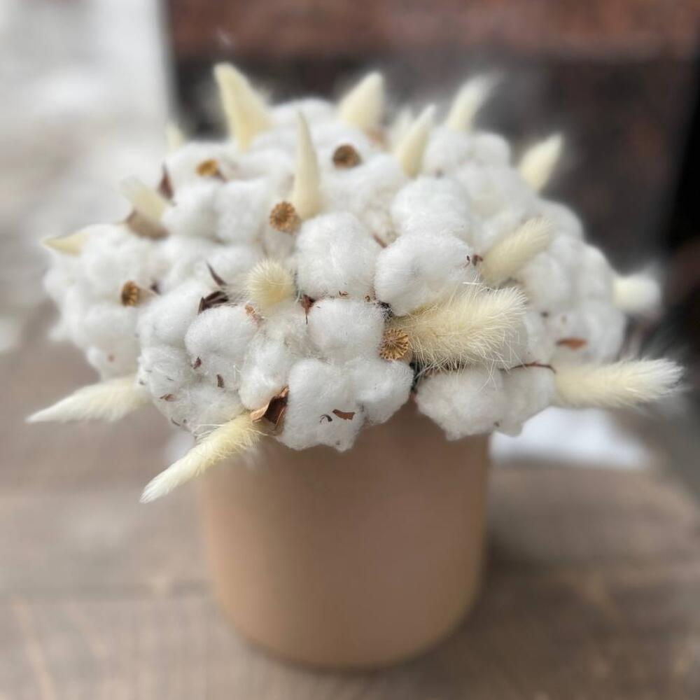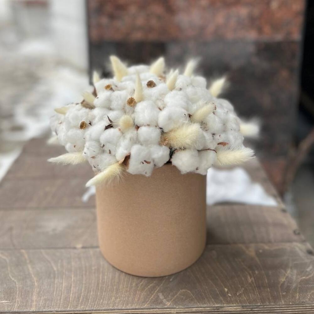 Хлопок натуральный – 25 шт.Лагурус (сухоцвет) – 15 шт.мак коробочка – 10 шт.Шляпная коробка – 1 шт.Оазис флористический – 1 шт.