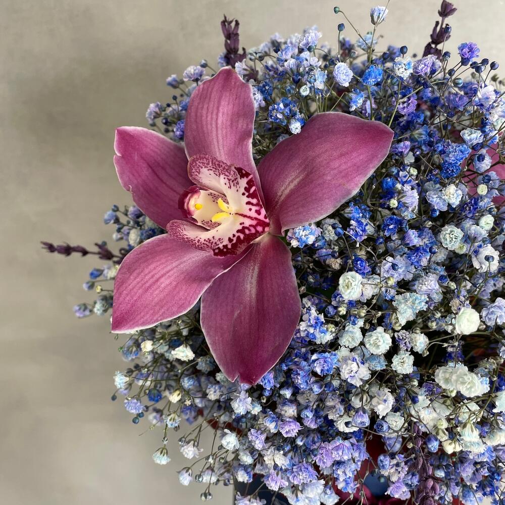 Гипсофила – 6 шт.Коробка шляпная – 1 шт.орхидея – 3 шт.Лагурус – 11 шт.Оазис флористический – 1 шт.