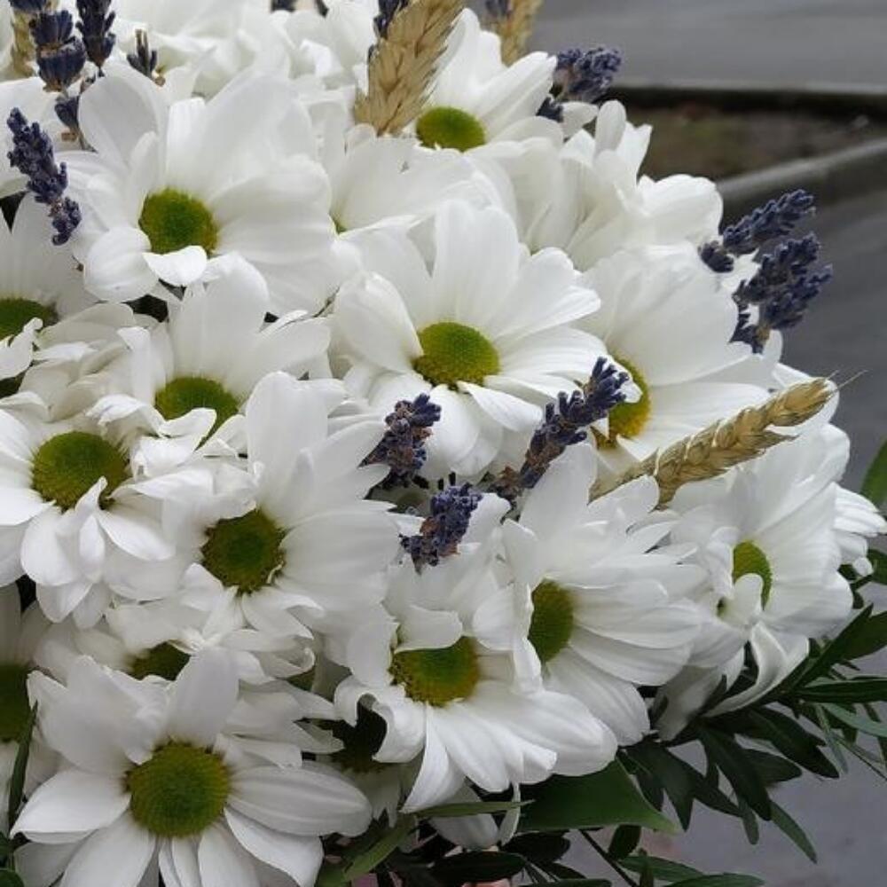 Лаванда (сухоцвет) – 25 шт.Коробка шляпная – 1 шт.Флористическая губка – 1 шт.Пшеница (сухоцвет) – 15 шт.ромашки – 25 шт.