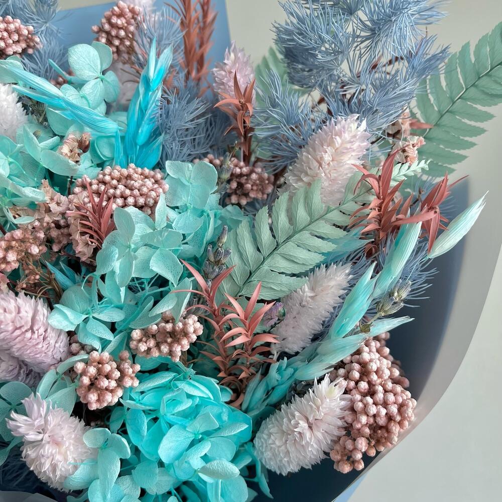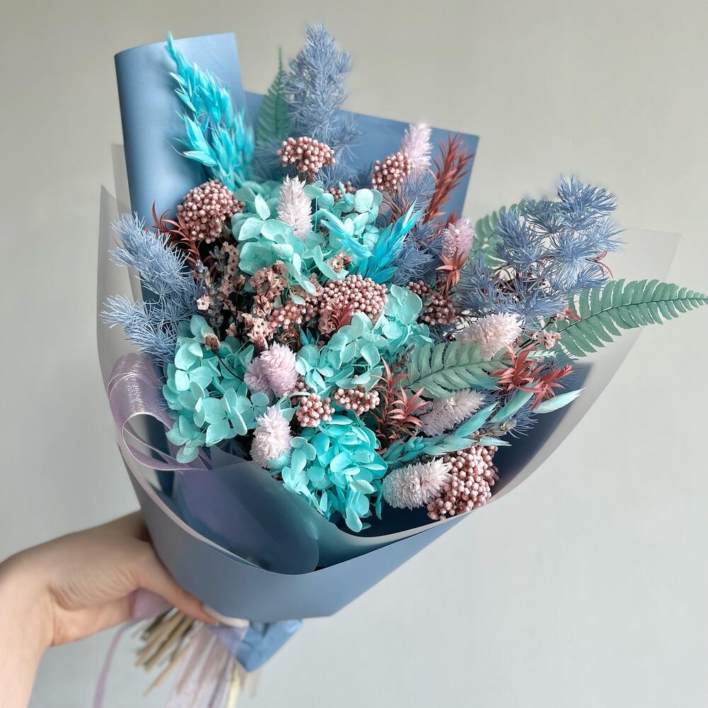 Озотамнус – 1 шт.Сухоцветы – 1 шт.Упаковка дизайнерская – 1 шт.Гортензия голубая – 1 шт.чайное дерево – 1 шт.