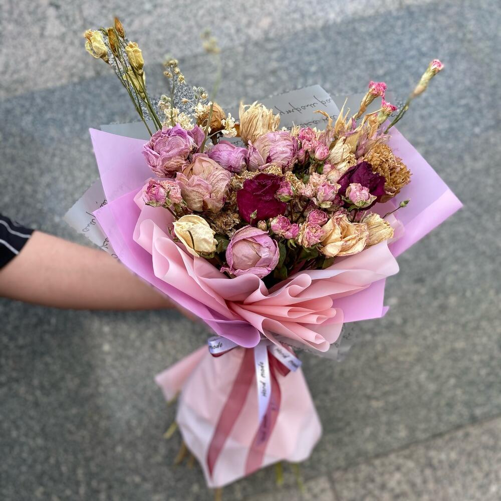 сухоцветы микс – 25 шт.сухоцвет пион – 7 шт.сухоцвет розы – 7 шт.Упаковка – 5 шт.Лента атласная – 2 шт.