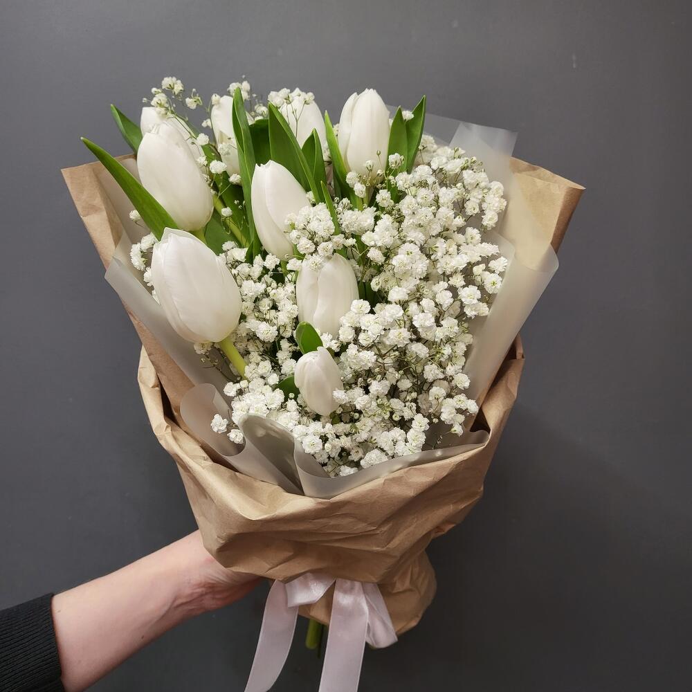 Тюльпан белый – 9 шт.Гипсофила – 2 шт.Упаковка дизайнерская – 1 шт.