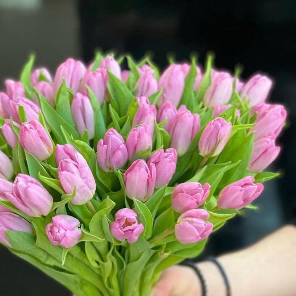 Тюльпан розовый – 51 шт.Лента атласная – 2 шт.Открытка – 1 шт.инструкция по уходу за цветами – 1 шт.хорошее настроение – 100 шт.коробка переноска – 1 шт.Кризал – 1 шт.