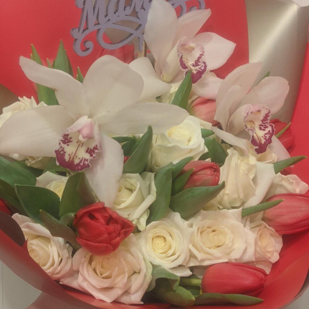 розы – 20 шт.тюльпаны – 10 шт.орхидея – 3 шт.Дизайнерская упаковка – 1 шт.