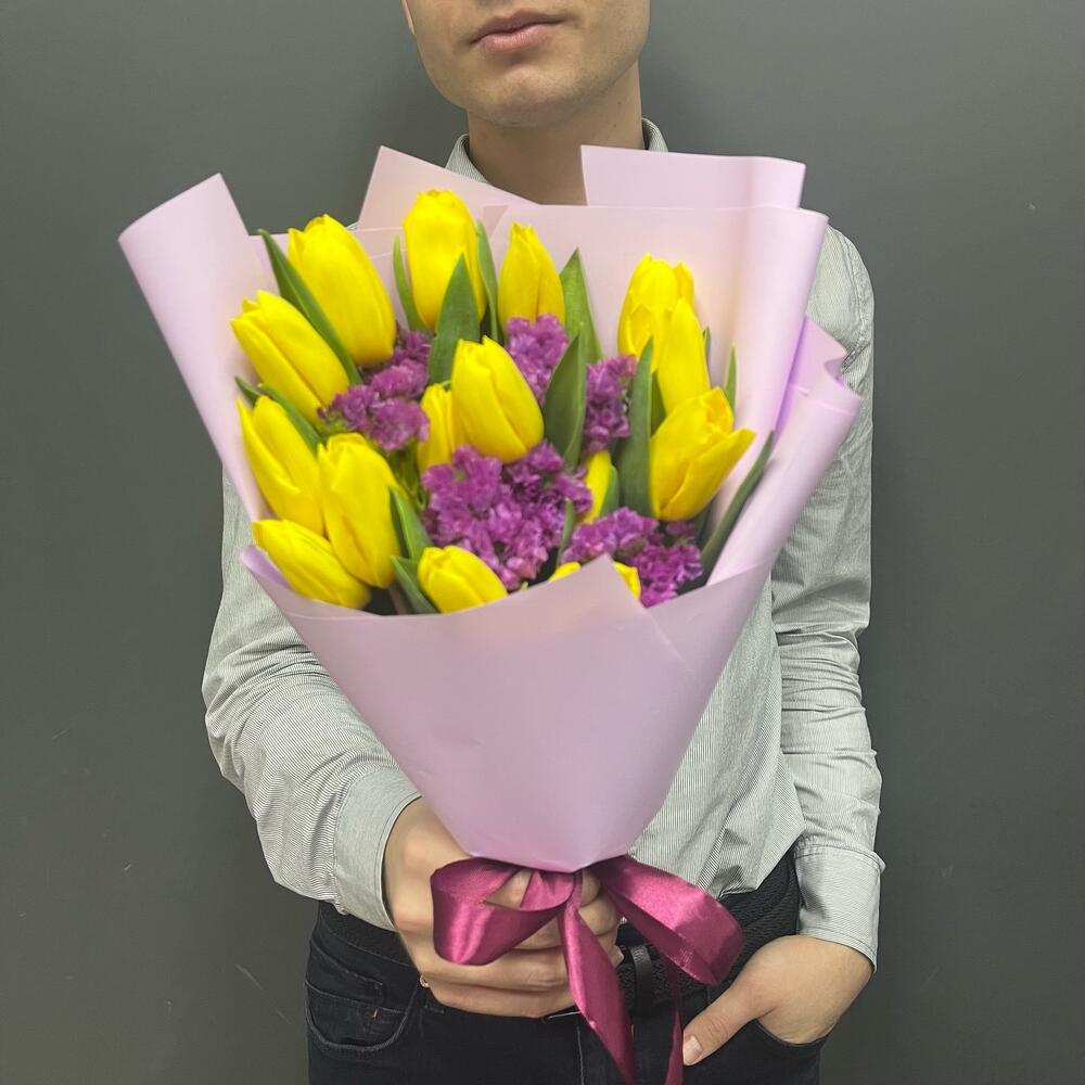 Тюльпан желтый – 15 шт.статица ярко-розовая – 1 шт.Упаковка корейская пленка – 1 шт.Лента атласная – 1 шт.
