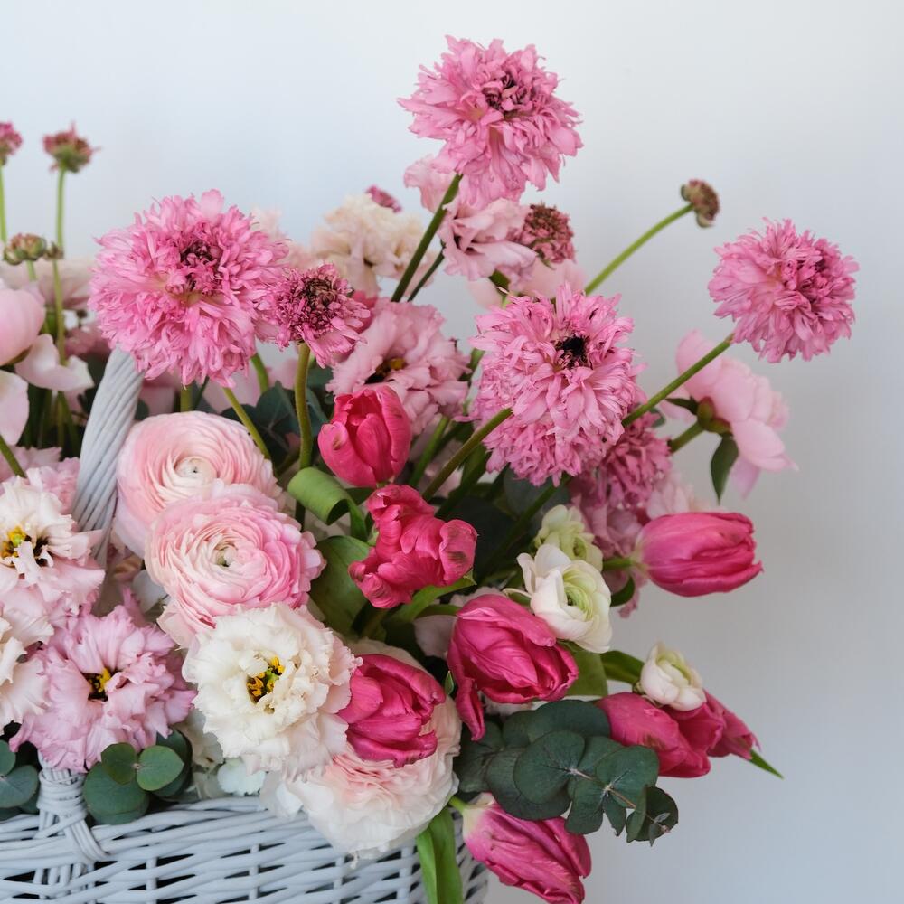 Гортензия – 3 шт.Тюльпан – 22 шт.Эвкалипт – 5 шт.Ранункулюс – 6 шт.Пион Сара Бернар – 10 шт.Оазис флористический – 2 шт.Ранункулюс ханой – 8 шт.Цимбидиум розовый – 1 шт.корхина плетеная – 1 шт.лизиантус пинк махровый – 5 шт.
