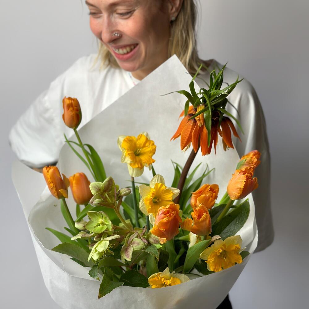 Небольшой рыжий букет из сезонных цветов