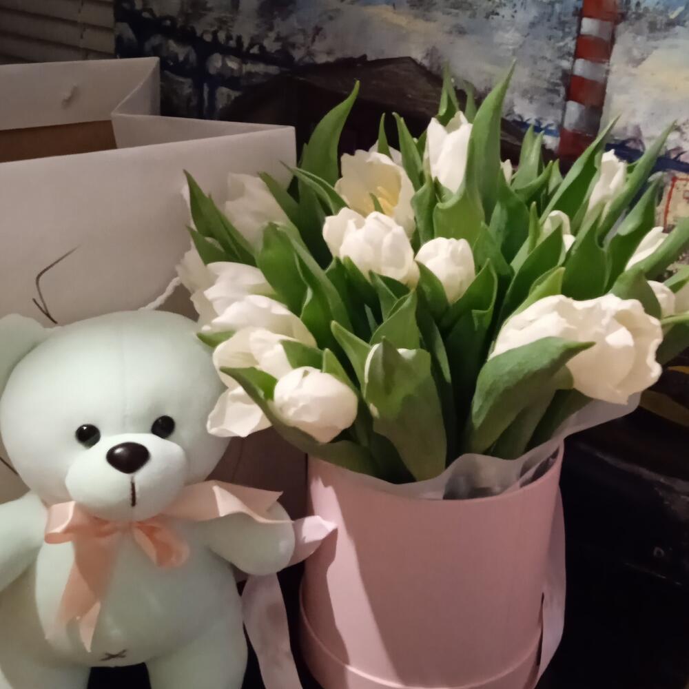 тюльпаны – 25 шт.Шляпная коробка – 1 шт.Флористическая губка – 1 шт.Мишка плюшевый – 1 шт.Пакет подарочный – 1 шт.