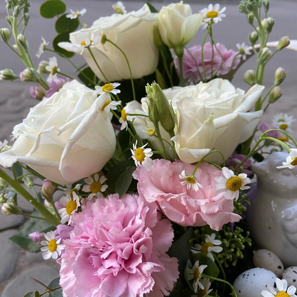 Верба – 3 шт.Корзина – 1 шт.Лизиантус – 1 шт.Тюльпан – 4 шт.Оазис – 1 шт.Матрикария – 1 шт.Фисташка – 2 шт.Птица декоративная – 1 шт.Хелеборус – 1 шт.березовые ветки – 3 шт.