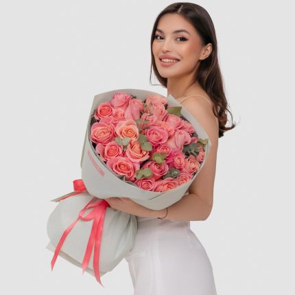 mono bouquet 89 из 25 кустовых пионовидных роз сорта classic sensation и эвкалипта