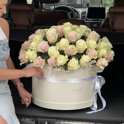 Жемчуга – Шляпная коробка с пионами, гортензиями и пионовидными розами