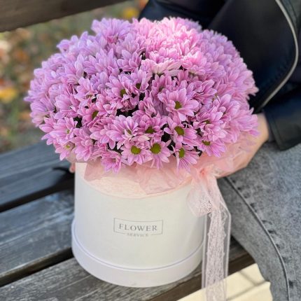 Коробка Робкий поцелуй из роз сорта квинси, охара, эустомы, генисты и диантуса