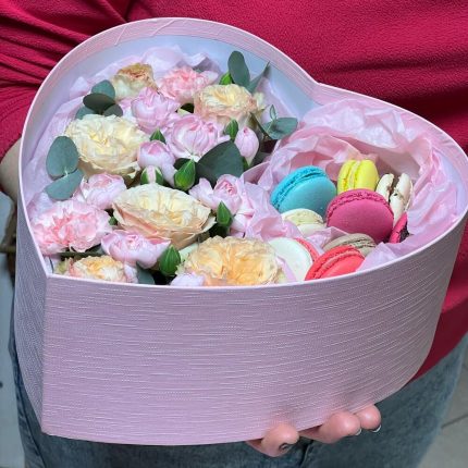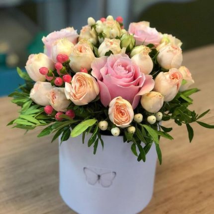 Коробка Жемчужина красоты из кустовых роз, альстромерии, эустомы и диантуса