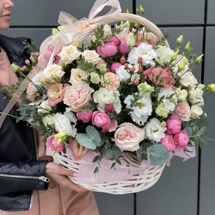 Роскошная корзина с пионовидной розой, гортензией и микстом зелени «Великолепная осень»