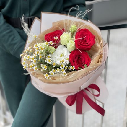 Букет Лучшее Признание S из танацетума и кустовой пионовидной розы сильвиа пинк