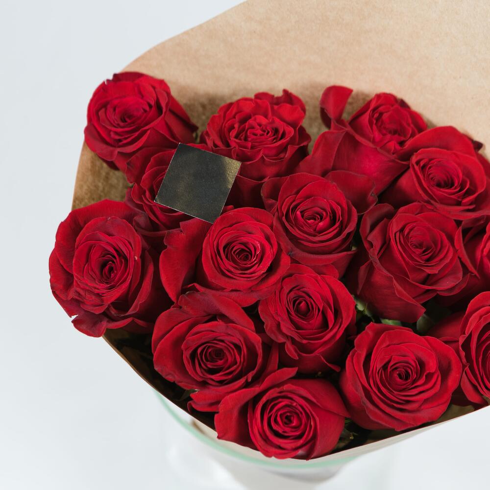 Роза Эквадор – 15 шт.Лента атласная – 1 шт.Крафт дизайнерский – 1 шт.